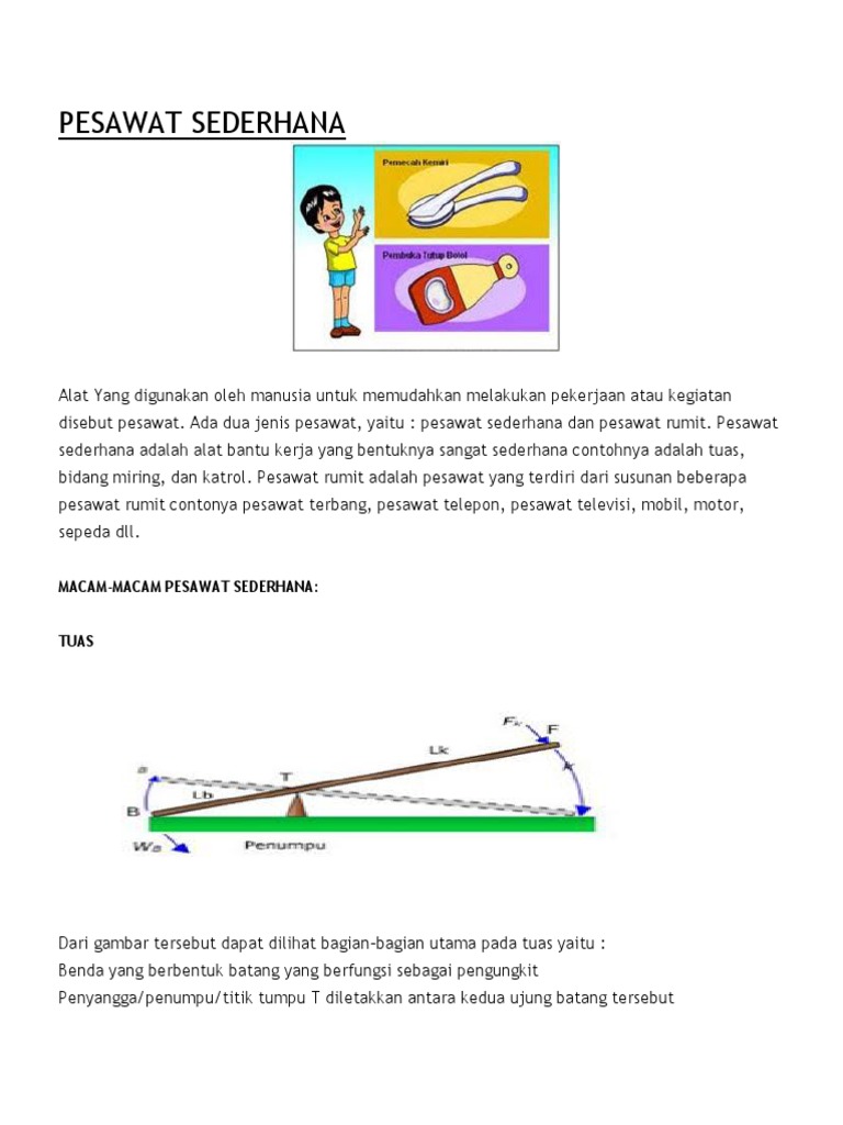 Pesawat sederhana adalah segala bentuk alat yang mampu meringankan pekerjaan manusia. Manusia selalu berusaha memperoleh kemudahan dalam melakukan pekerjaan. Pesawat sederhana dibedakan menjadi 4 macam, yaitu tuas (pengungkit), katrol, bidang miring dan roda bergandar (roda berporos). Sekian dulu materi kali ini, bagikan agar teman yang lain bisa membacanya. Titik kuasa, yaitu tempat diberikannya gaya kuasa. Dalam mempelajari pesawat sederhana, kamu akan mengenal istilah berikut ini. Pesawat sederhana sering diartikan sebagai sebuah alat yang digunakan untuk mempermudah pekerjaan yang dilakukan manusia tanpa mengurangi usaha yang dilakukan. Titik beban, yaitu tempat melekatnya beban. Pesawat sederhana pesawat sederhana adalah alat sederhana yang dipergunakan untuk mempermudah manusia melakukan usaha. Keuntungan mekanik yang berhasil diperoleh pengendara sepeda, adalah kumpulan dari semua pesawat sederhana yang terdapat pada sebuah sepeda dan tersusun menjadi satu membentuk benda. Dalam artikel ini, nanti akan dipaparkan contoh pesawat sederhana bidang miring sekaligus gambarnya biar lebih mudah dibayangkan. Apa yang dipermudah adalah gaya dan usaha yang harus dilakukan dalam mengupayakan sesuatu. Pesawat sederhana berdasarkan prinsip kerjanya dibedakan menjadi :